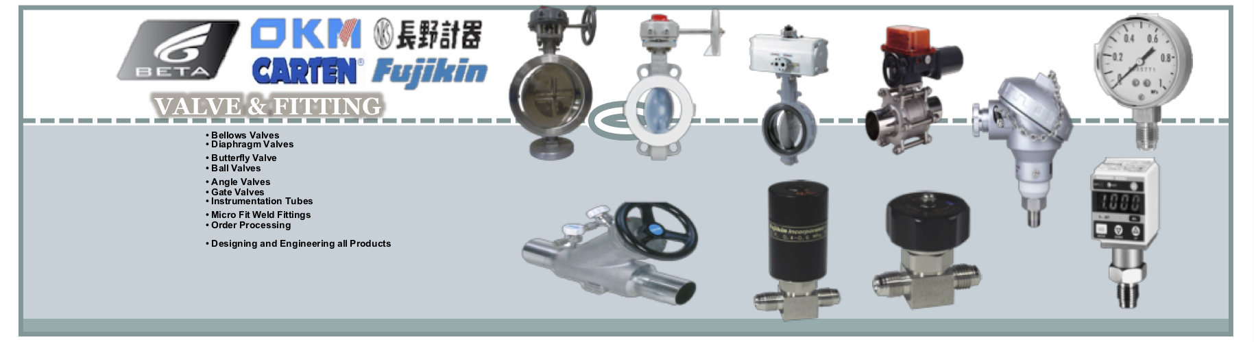 高純不銹鋼EP、BA/MP、AP等級管子/管道/管件;高純不銹鋼隔膜閥、波紋管閥、蝶閥、球閥、針閥、調壓閥等等;超純VCR、焊接、卡套接頭;以及設備應用材料:壓力傳感器、壓力表、鋼瓶電子稱、火焰探測器、氣體探測器、鋼瓶緊急切斷裝置、加熱毯、加熱線、PTFE保溫纏繞帶;化學品供應系統中的PFA閥門以及括口和焊接接頭,不銹鋼內襯PFA/PTFE管道、閥門、接頭等配件。